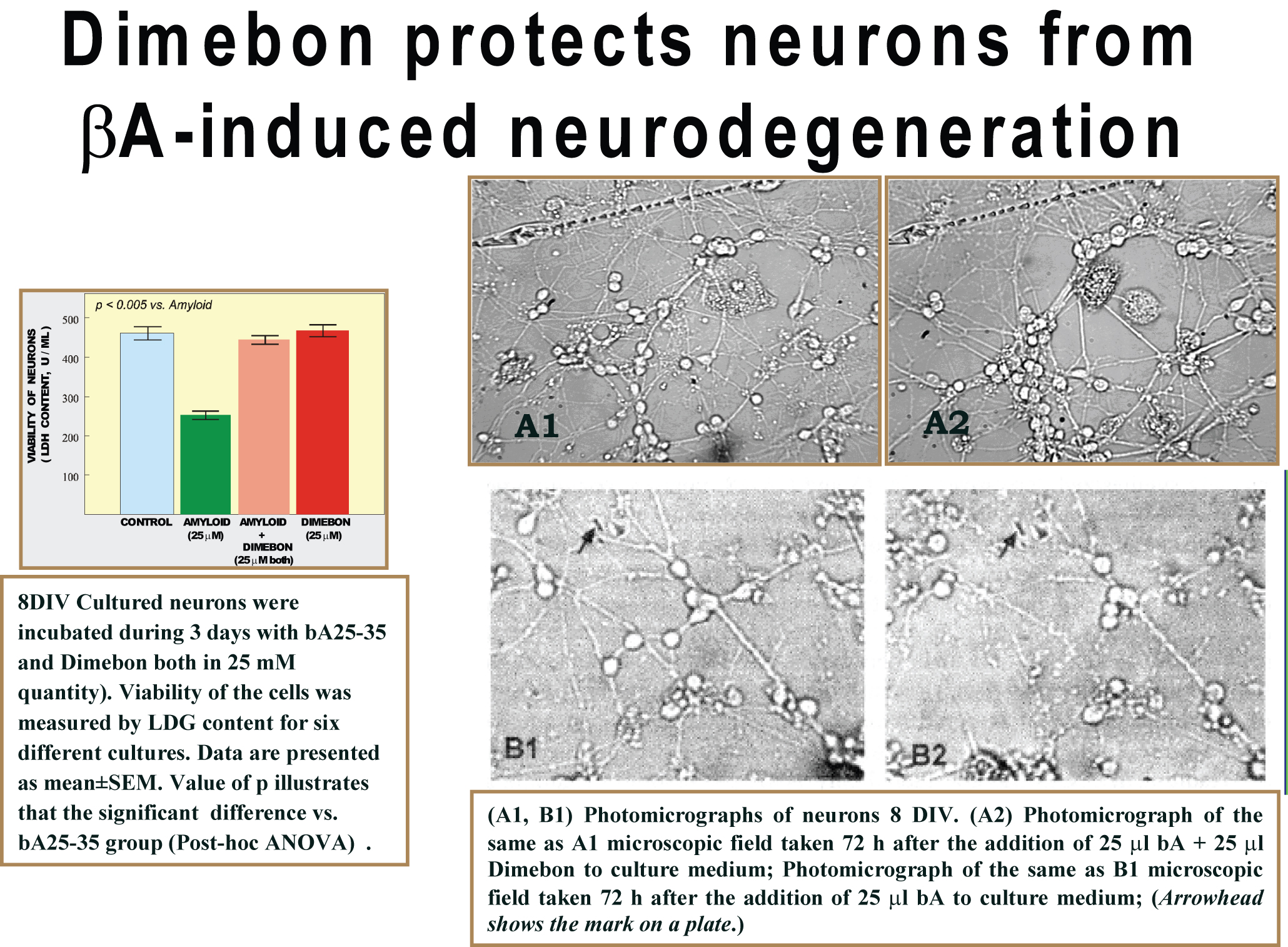 Важным звеном в развитии процессов нейродегенерации разной этиологии является увеличение окислительных повреждений нейронов, а также нарушение функций митохондрий и увеличение их чувствительности к индукторам процесса скачка митохондриальной проницаемости (mitochondrial permeability transition, MPT). Сотрудниками лаборатории нейрохимии ФАВ впервые было установлено, что ряд нейротоксинов, применяемых для моделирования нейродегенеративных заболеваний, в частности фрагмент (25–35) b-амилоидного пептида потенцируют МРТ. В то же время известные нейропротекторы — эндогенный нейропротектор N-ацетилсеротонин, экстракт Гингко Билоба, мексидол, мемантин, а также Димебон, повышают устойчивость митохондрий к индукторам МРТ.
