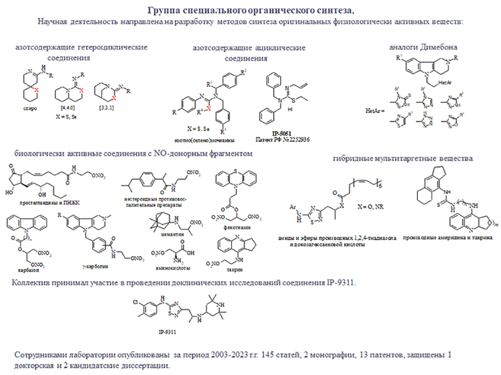 В рамках институтской программы по поиску нейропротекторов и стимуляторов когнитивных функций осуществлён синтез оригинальных лигандов глутаматных рецепторов NMDA- и AMPA-подтипов как потенциальных препаратов для терапии нейродегенеративных заболеваний. Работа по синтезу проводится в Отделе медицинской и биологической химии в тесном контакте с биологическими подразделениями Отдела. За последние десятилетия синтезированы и протестированы свыше тысячи оригинальных соединений различных классов.
